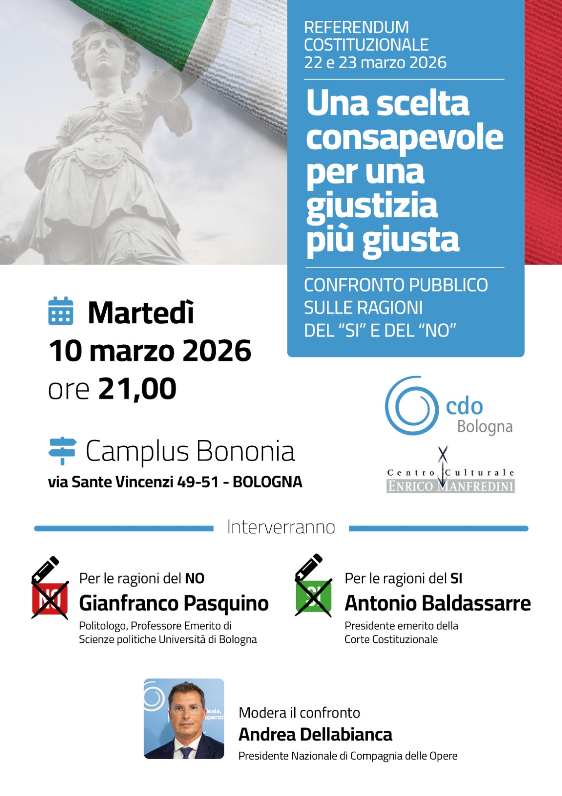 “Come Compagnia delle Opere sentiamo la responsabilità di andare al centro dei contenuti della riforma, evitando letture ideologiche o contrapposizioni sterili. Il nostro obiettivo è favorire un dialogo serio e leale tra le ragioni del Sì e quelle del No, perché solo un confronto autentico consente un pieno discernimento. È proprio in quest’ottica che sosteniamo l’incontro che vedrà il dialogo tra due figure di primissimo livello come il Sottosegretario Alfredo Mantovano e il Professor Enrico Grosso. Non abbiamo interesse per le polemiche ma per la comprensione: creare spazi in cui posizioni diverse possano confrontarsi è a nostro avviso, un contributo essenziale alla qualità della vita democratica del Paese” – dichiara Andrea Dellabianca, Presidente nazionale Cdo.